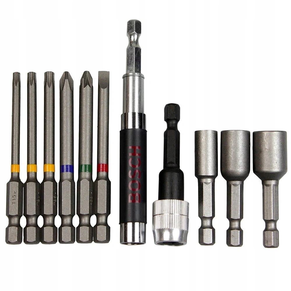 Zestaw końcówek, którego liczne rodzaje końcówek umożliwiają wykonywanie wielu zróżnicowanych zadań za pomocą wiertarko-wkrętarki. Końcówki w tym zestawie marki Bosch są oznaczone kolorami i zebrane w praktycznej, wygodnej w transporcie skrzynce. Zawiera dwa magnetyczne uchwyty na końcówki, z których jeden jest wyposażony w szybkozłączkę, nasadki oraz wiele rodzajów końcówek w różnych rozmiarach: