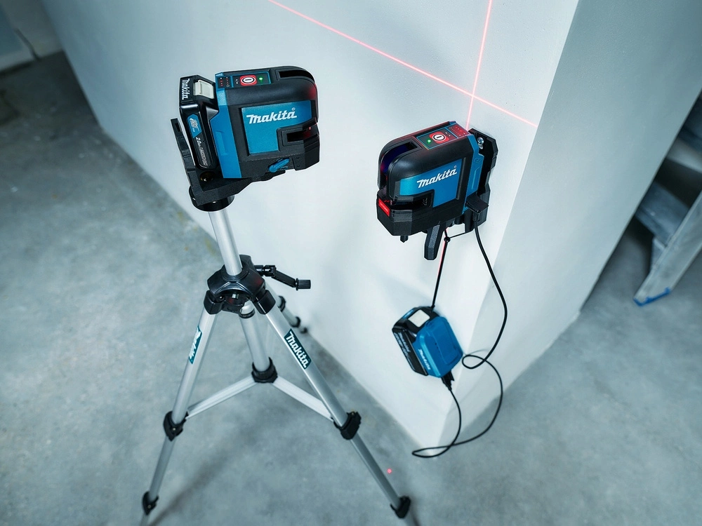 - Samopoziomujący laser krzyżowy z czerwonymi pionowymi i poziomymi liniami, które mogą być używane osobno lub razem.